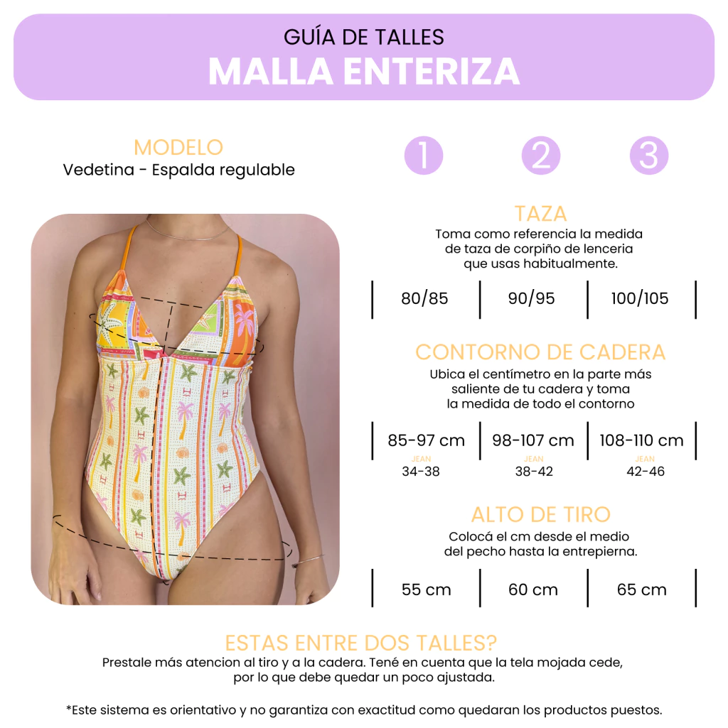 Enteriza estampada vedetina, brinda una comodidad excepcional gracias a su contorno elastizado y sus breteles regulables que se adaptan perfectamente a tu figura. Incluye tazas soft desmontables. Confeccionado en Lycra certificada.